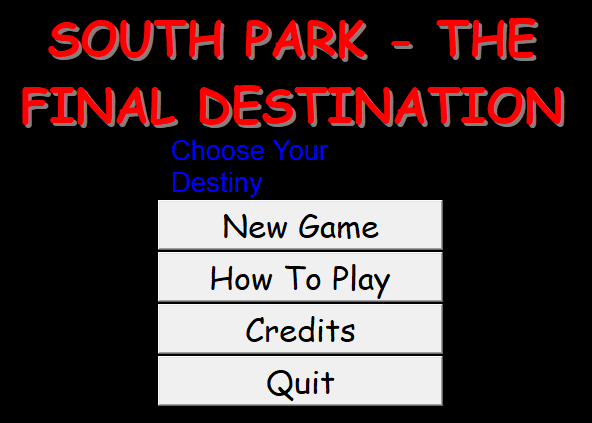 A game splicing South Park and Final Destination, the boys and Mr Garrison are about to board a flight to France, but not before Stan envisions the plane exploding; his vision is ignored and Kenny is killed as the vision becomes a reality! Now Death is after Stan, Kyle and Cartman as they dodged the plane disaster meant to kill ALL of them, and Stan must dodge everything Death throws at him in this demo.
