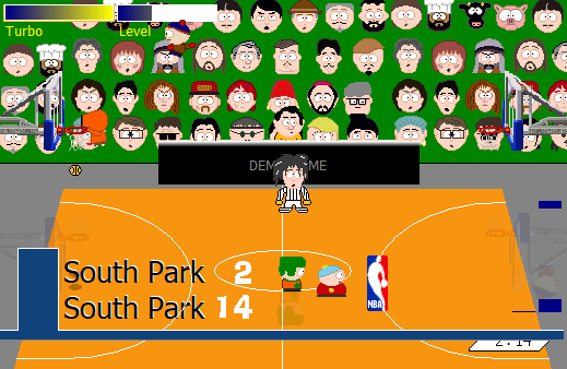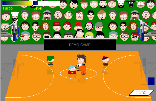 A non-interactive demonstration of a South Park basketball game, in which Stan & Kenny play against Cartman & Kyle to try and score as many hoops as possible.